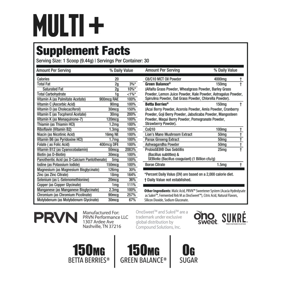 PRVN Multi is an all-in-one daily multi vitamin powder to help support a healthy lifestyle through a full spectrum blend of 50+ key vitamins, minerals, and whole food ingredients. There has never been an easier or more delicious way to enhance your health, longevity, and energy levels naturally.
